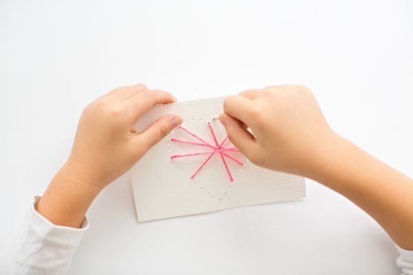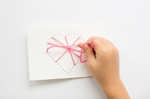 Agora, siga passando a linha pelos furos do contorno do coração.