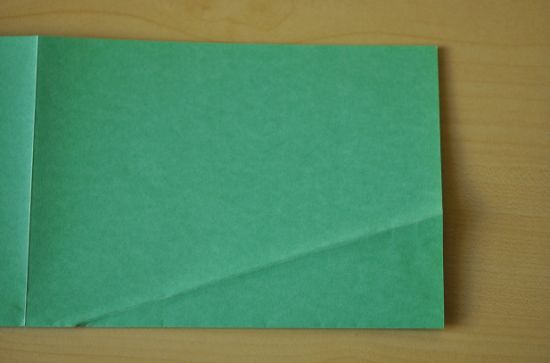 Em seguida, dobre a folha ao meio no sentido do comprimento, e faça uma marcação com uma dobra uma diagonal, mas esta dobra deve terminar antes do vinco do meio da folha. Abra e faça o mesmo do outro lado da folha A4. Lembrando que esta diagonal será a lateral do triângulo que forma a árvore de natal.