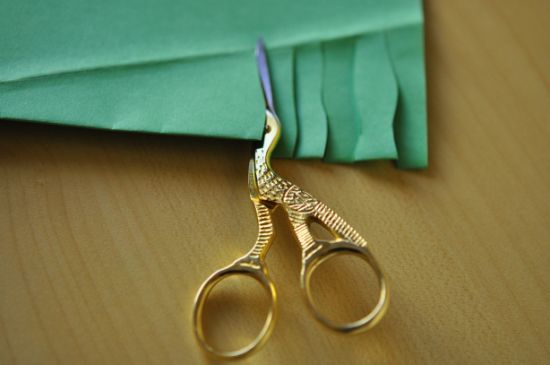 Logo após, com o auxílio da tesoura, corte a extremidade do papel, mas respeitando o limite da dobra em diagonal. Faça cortes sinuosos ou com o “movimento” que você quiser, até chegar ao final.