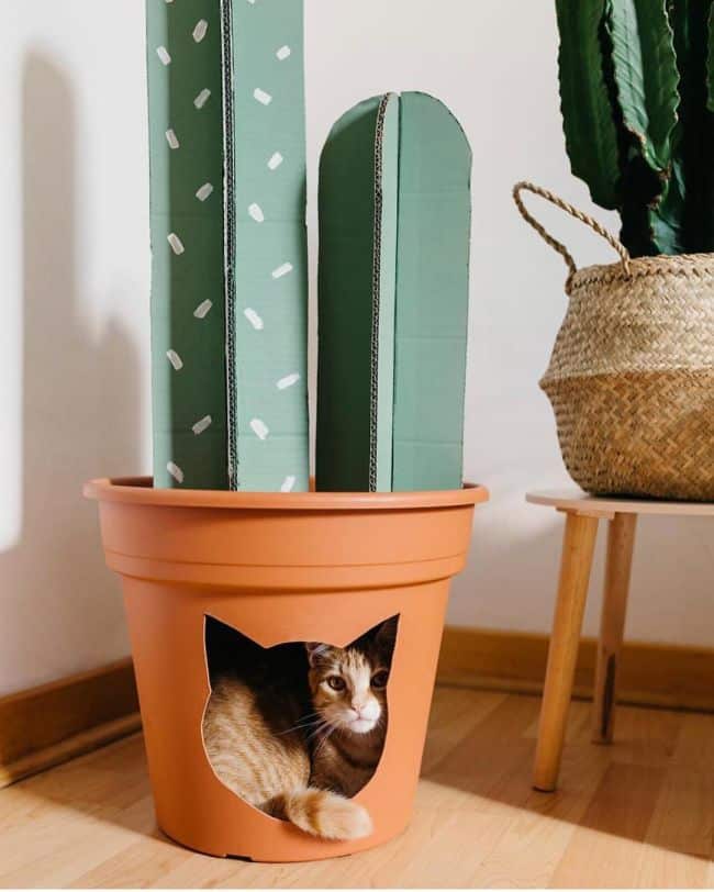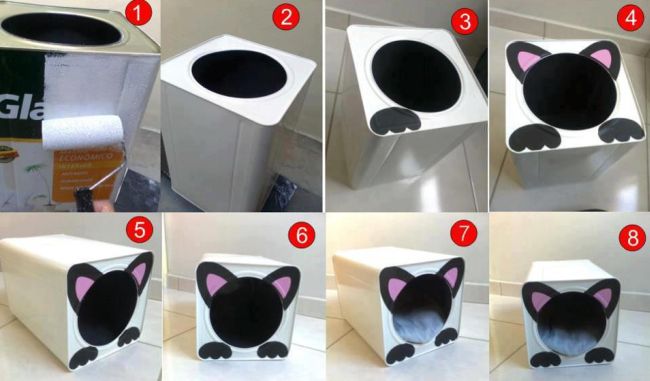 Você também pode improvisar uma casinha para gato com vaso de plástico grande, em vez e usar uma bacia. Basta colocar uma tampa na borda do vaso e enfeitar como desejar.