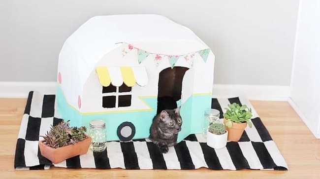 Com círculos de papelão você cria uma estilizada casinha. Mas com uma simples caixa pintada também é possível fazer bonito para o seu gato.