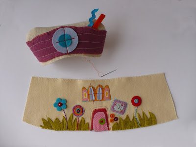 Comece desenhando um formato oval no feltro. Depois corte uma tira de feltro com largura que você deseja (lembrando que a largura da tira de feltro será a altura de seu porta-treco) e comprimento que circunde a forma oval. E corte também o telhado de sua casinha. E então costure todas as partes juntas do telhado, e à máquina.