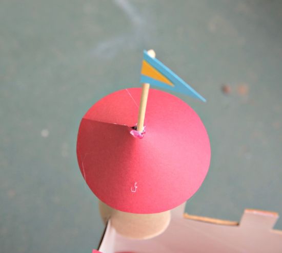 Em seguida, monte as quatro torres do castelo. Faça cones bem largos com a cartolina vermelha e antes de colar fixe um palito para churrasco no centro. Depois faça uma bandeirinha com o modelo de sua preferência e cole na ponta do palito. Cole este telhado em um dos lados do rolo de papel higiênico. Pinte uma janela na torre ou corte uma janela de um papel amarelo e com detalhes feitos com a caneta preta. E cole cada torre em um dos cantos do castelo.