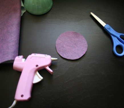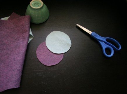 Comece separando todos os materiais que você vai utilizar em seu artesanato. Risque e corte dois círculos iguais nos feltros escolhidos.