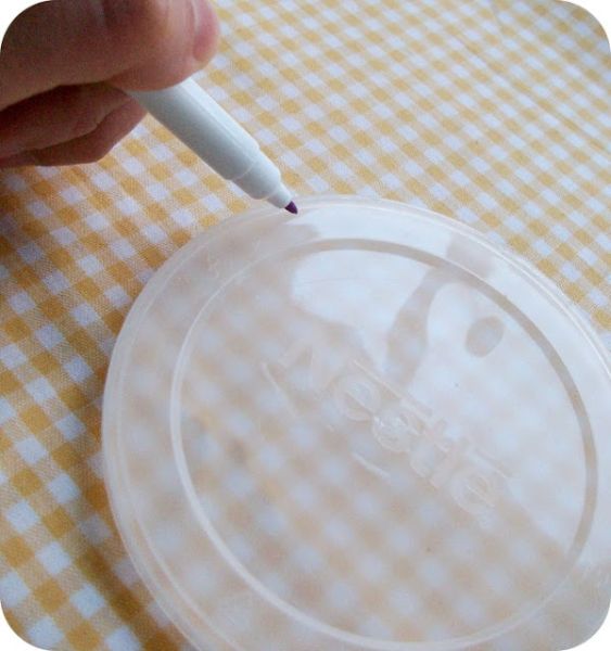 Em seguida, desenhe e corte 5 círculos com tamanho de 10 cm, no tecido estampado e, com a mesma medida, desenhe e corte outros 2 círculos do tecido branco. E para facilitar seu trabalho você pode utilizar tampas de plástico ou outros recipientes circulares.