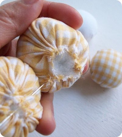 Em seguida, faça um ponto corrido ao redor da borda de cada círculo. Após fazer o ponto em toda a borda, puxe a linha um pouco para obter uma pequena “bolsa” e preencha com a fibra sintética. E termine puxando a linha e faça um ponto para fechar o saco. Repita esse procedimento para todos os outros 6 círculos.