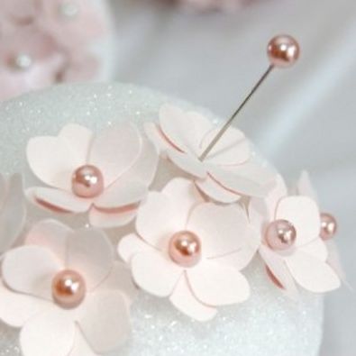 Em seguida, fixe a flor já com o alfinete no centro na bola de isopor. E faça isso em todas as bolas que você for usar, mas cobrindo muito bem a bola, posicionando uma flor bem junto à outra flor, sem deixar entrever o fundo da bola de isopor.