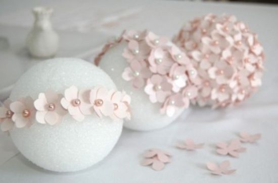 Logo após, com todas as bolas de isopor já cobertas pelas flores de papel ou de EVA fino, basta posicioná-las no recipiente escolhido. E está pronto seu enfeite de mesa!