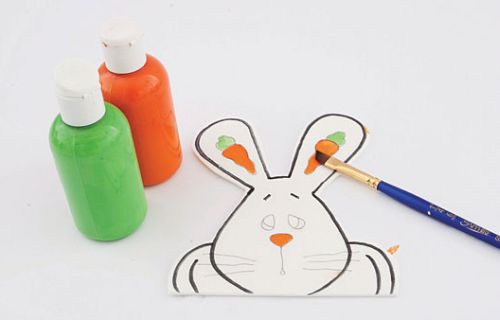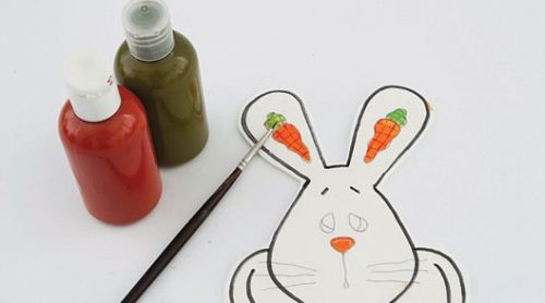 Em seguida, pinte as cenourinhas que estão desenhadas nas orelhas e o focinho na cor laranja, utilizando o pincel chanfrado. Com a outra tinta, em tom verde, pinte as folhas da cenoura, utilizando o mesmo pincel já limpo.