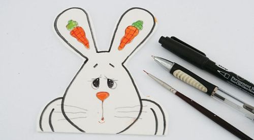 Agora, com o auxílio da caneta permanente, pinte todo o olho do coelho; e com a tinta branca, faça pequenos pontos brancos nos olhos do coelho. Com a esferográfica, faça os cílios e os bigodinhos. Usando a tinta de cor canela, faça uma pequena bolinha (na boquinha) utilizando o pincel fino.