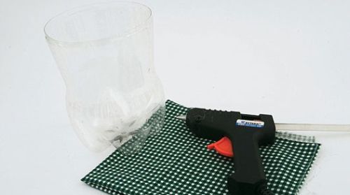 Em seguida, meça a garrafa PET e corte-a, deixando-a com 15 cm. Utilizando a cola quente, encape toda a garrafa com o tecido.