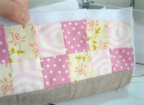 Em seguida, corte a manta acrílica com o tamanho um pouco maior que o tamanho dos tecidos e passe uma costura reta nas emendas dos estilos de tecidos.