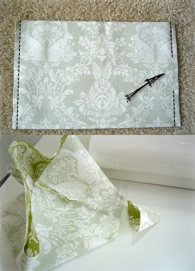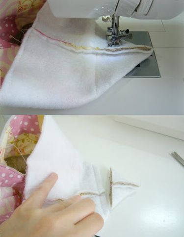 Agora, dobre os cantos inferiores criando “pontas” e passe duas costuras retas e corte a ponta.