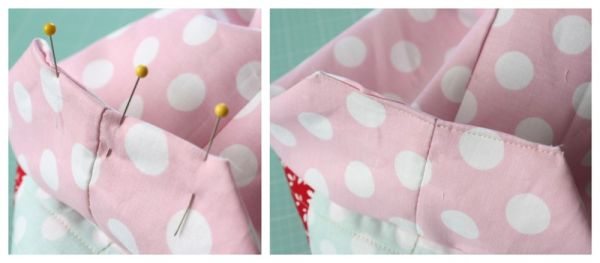 Em seguida, passe todas as costuras, abrindo-as e dobre a parte do fundo para costurar os cantos. No forro deixe uma parte do canto sem costura, para poder virar posteriormente.