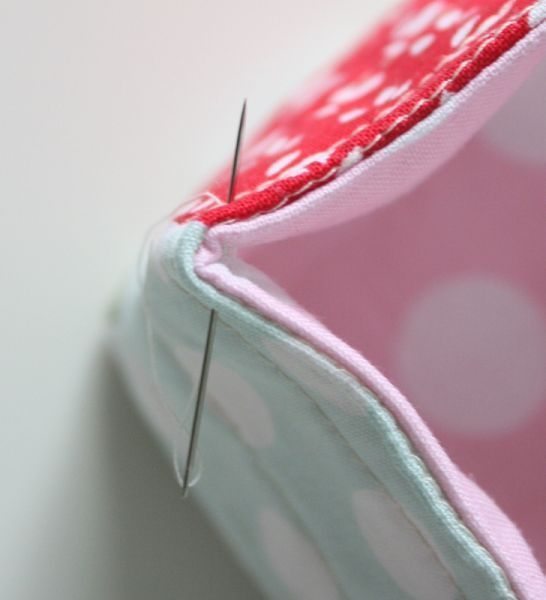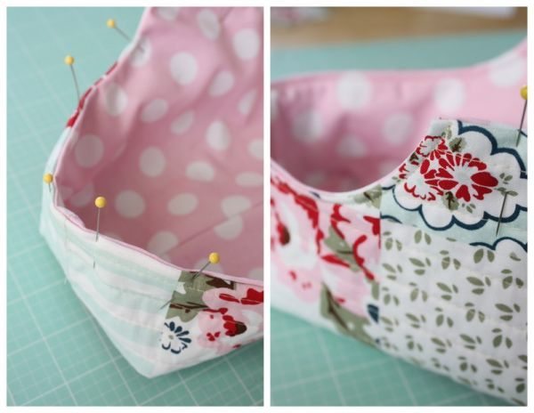 Logo após, posicione a parte de fora dentro do forro, com os lados do direito dos tecidos juntos, para dentro.