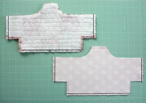 Agora, costure o forro e a parte de fora. Posicione uma parte do trabalho sobre a outra, com os lados do direito dos tecidos juntos, para dentro, e costure o fundo e as laterais.