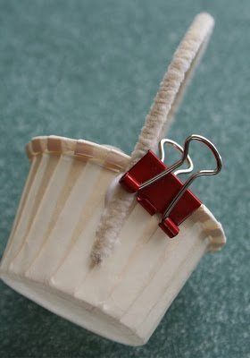 Cole um pedaço de cordão na minicestinha ou no copo descartável, para formar a alça.