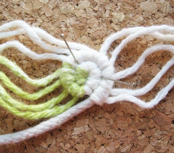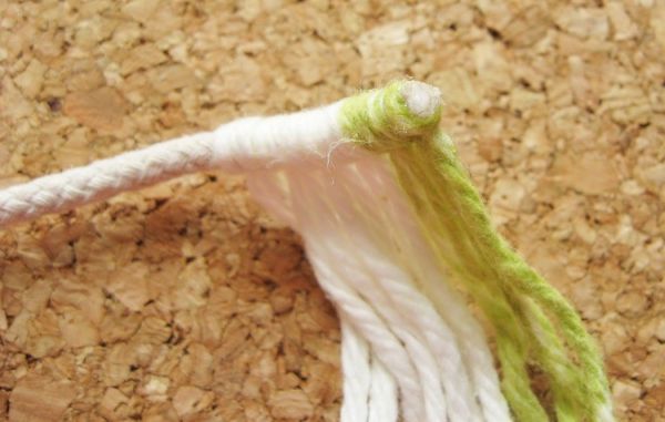 Logo após, siga fazendo o mesmo processo com as outras cores de cordinha ou lã que você quiser utilizar em sua peça.