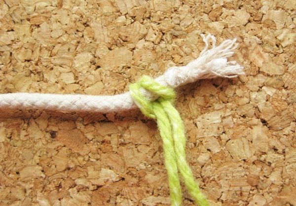 Comece posicionado a corda escolhida sobre a cortiça. Depois passe a ponta da corda escolhida por dentro de uma laçada da cordinha fina escolhida ou de uma lã, com dois fios da cordinha ou da lã.