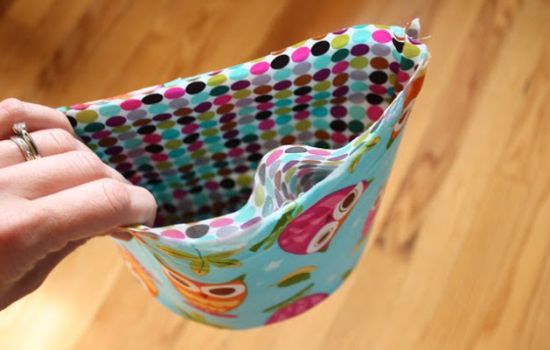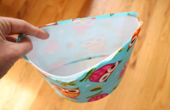 Logo após, posicione a outra cesta de tecido já costurada e com as costuras para dento, dentro da cestinha com entretela.