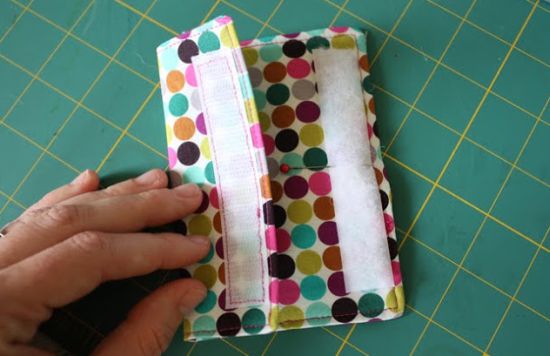Em seguida, pegue a tira mais larga de tecido, aplique a entretela fina, dobre ao meio, passe costura ao redor, mas deixando uma abertura para virar, desvire a peça, pesponte ao redor e pregue pedaços de velcro para formar um cilindro.