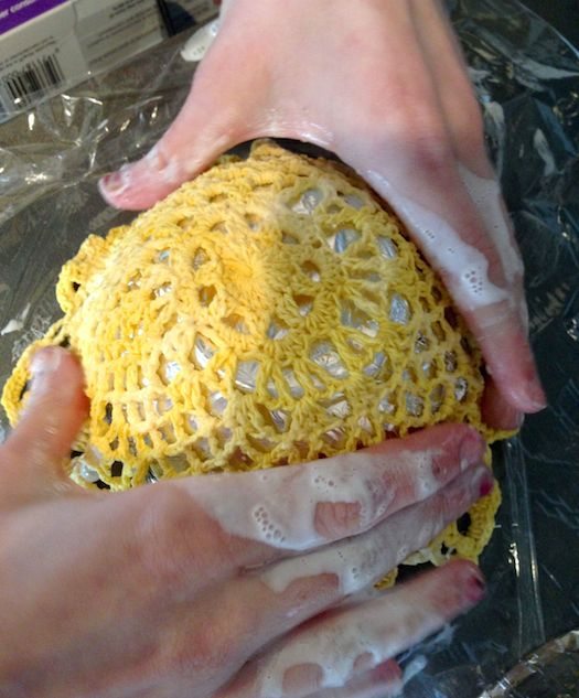 Para finalizar a sua peça, assim que a cola estiver totalmente seca, retire o pano de crochê do molde. E está pronto!