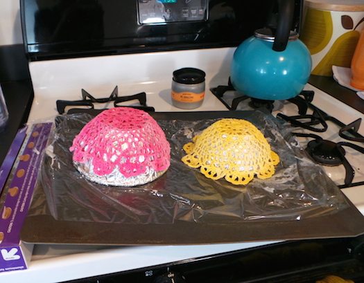 Forre o local onde você vai trabalhar com a sua peça, com jornal velho, papel velho, papelão, tecido velho ou plástico. Posicione o recipiente encapado sobre o forro e por cima coloque a toalhinha de crochê, mas arrumando com os dedos, para que a peça fique com o formato do fundo do recipiente escolhido.