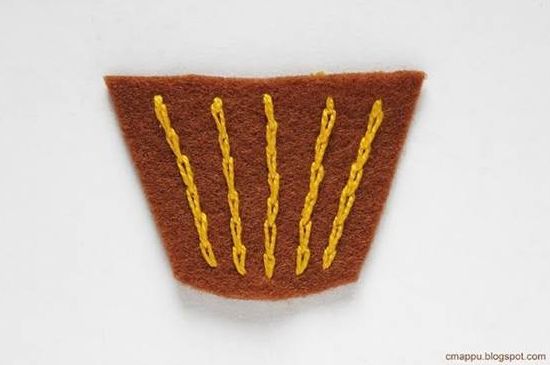 Logo após, faça detalhes bordados na base do cupcake. Nesta etapa você pode fazer o ponto que quiser, como o ponto correntinha, apresentado neste exemplo, ou outro ponto de bordado que você goste.