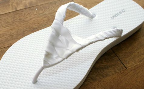 Comece enrolando a fita de cetim branca em toda a tira do chinelo, de forma que cubra toda a tira. Mas faça bons acabamentos nas bases da tira, dando pontinhos com a agulha e linha branca.