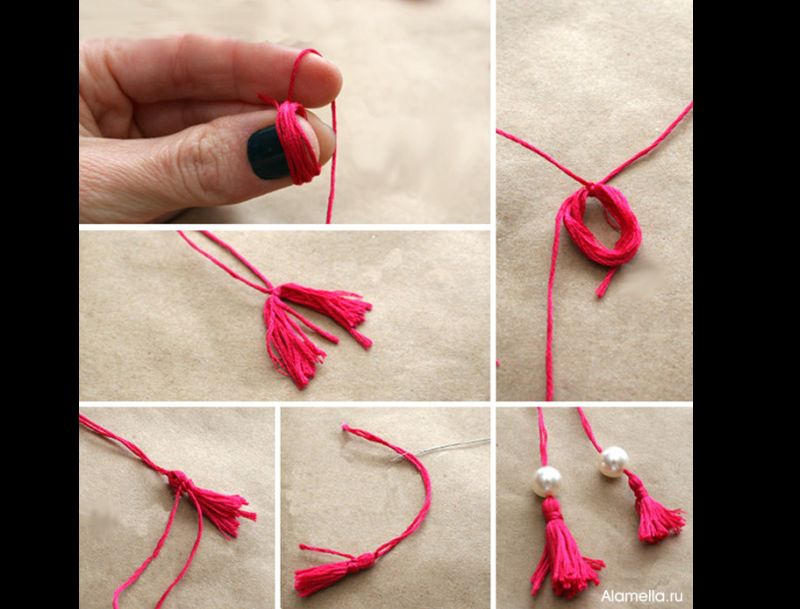 Faça o barbicacho. Enrole no dedo algumas voltas de linha para bordado, amarre no meio e corte as pontas. Amarre outro pedaço de linha juntando as duas partes. Depois passe a linha que está sobrando pela agulha para bordado e passe pelas pérolas maiores.