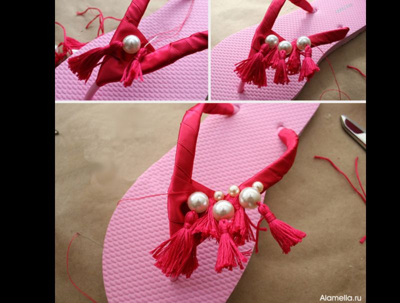 Costure estes barbicachos com pérolas menores pela tira do chinelo, até chegar ao tamanho desejado.