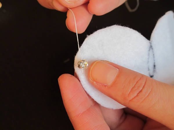 Agora, comece a costurar as pedrarias escolhidas no feltro, com o auxílio do fio de nylon ou da linha para costura e da agulha de mão.