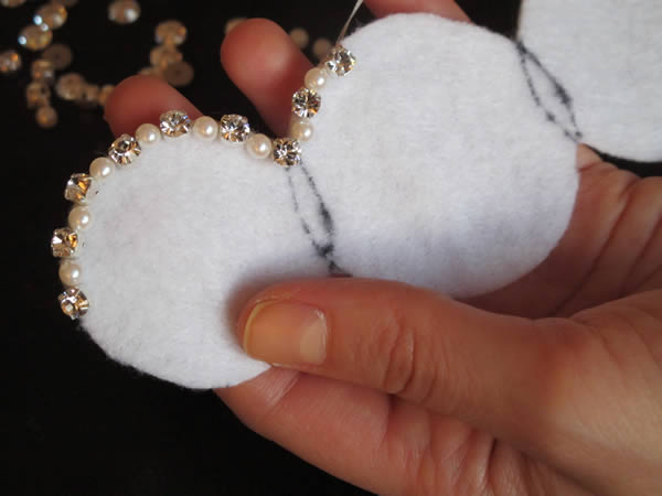 Agora, siga fixando pedrarias pela sua peça de feltro.