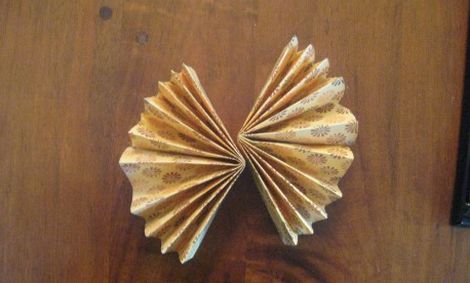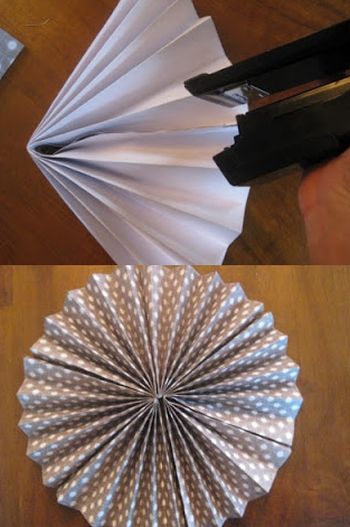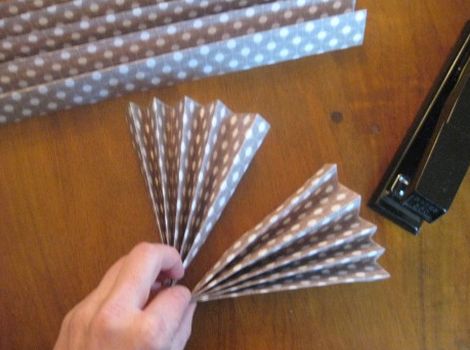 Agora, dobre as metades novamente ao meio e grampeie, como foi feito com os leques maiores. Mas você só vai precisar de 2 leques para fazer um círculo menor.