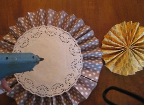 Em seguida, você pode tanto deixar os círculos grandes e pequenos em sua forma original quanto pode juntá-los com o papel de forrar bandejas ou qualquer outro material de sua preferência. E para juntar os círculos e materiais, basta colá-los com o auxílio da cola quente. E está pronto! Agora basta colar na parede, e para isso você pode usar fita dupla face, para facilitar o seu trabalho.