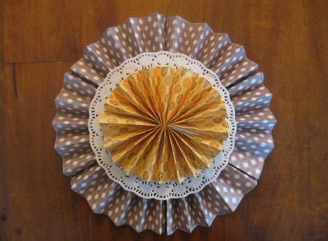 Logo após, se você quiser fazer um círculo pequeno, pois o interessante é mesclar tanto círculos grandes quanto círculos pequenos na parede atrás do bolo ou da mesa que você quiser, basta dobrar uma folha de papel formando o leque (da forma como já foi mencionado) e cortar esta peça ao meio.