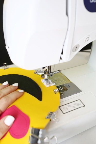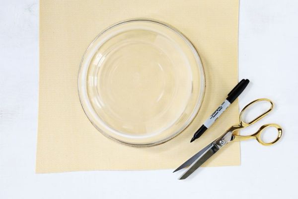 Comece riscando dois círculos no tecido de vinil amarelo.