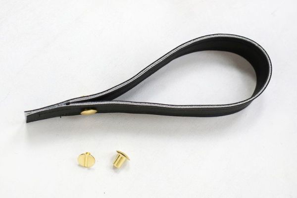 Em seguida, passe uma costura reta de cada lado da tira e prenda as pontas, formando uma laçada, com o auxílio de uma tachinha.
