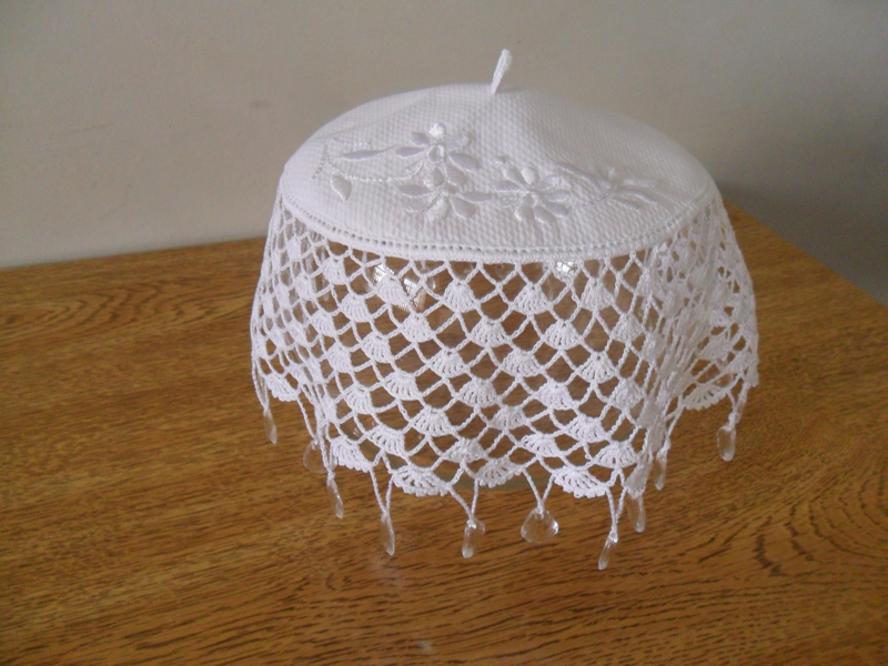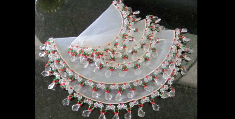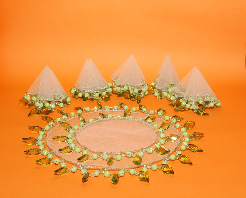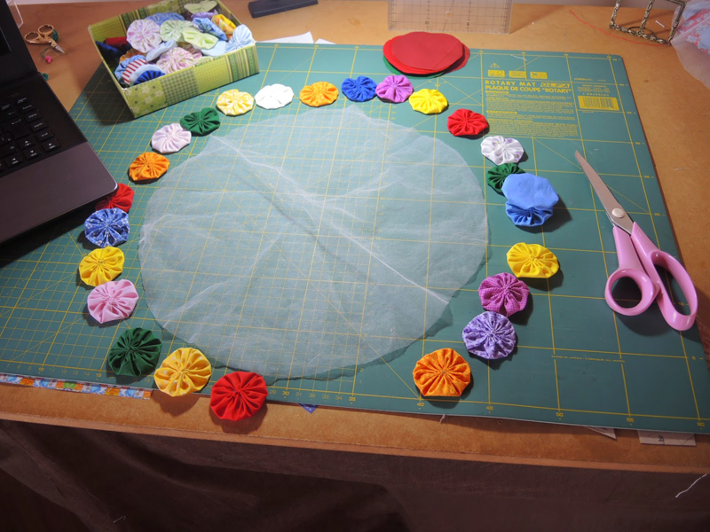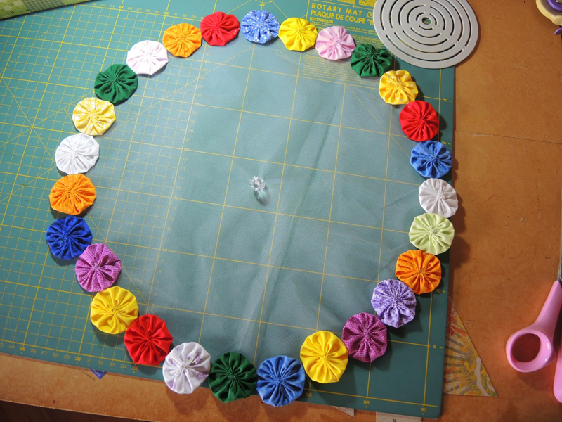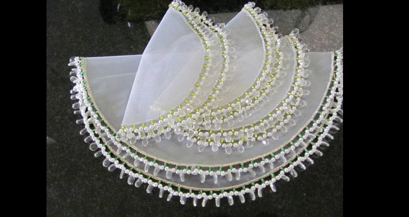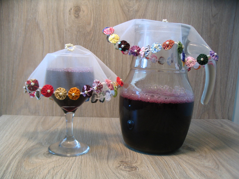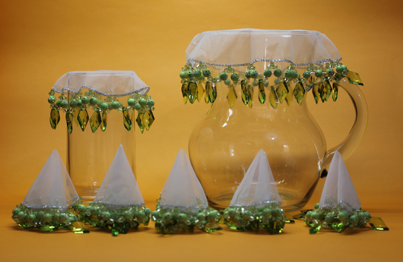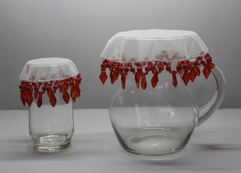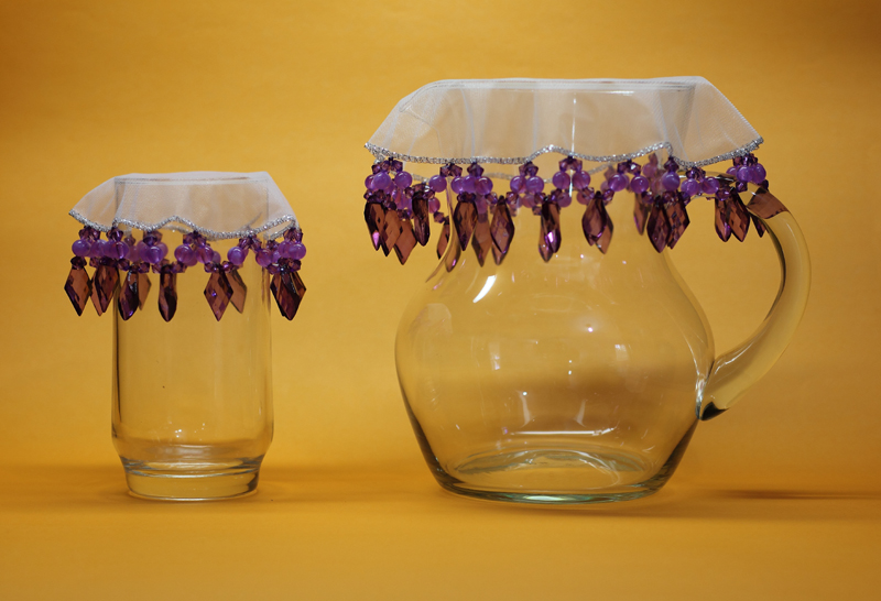 Corte a organza em círculo, para ser a base do cobre jarra ou copos. Faça os fuxicos. Para fazer fuxico basta cortar círculos de tecido, alinhavar a borda, fazendo uma barrinha, e puxar a linha, ao final, arrumando o fuxico com os dedos. Se quiser, pode ainda colocar uma pérola ou uma pedraria no meio de cada fuxico.
