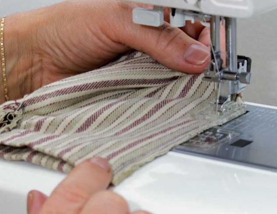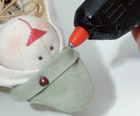 Logo após, desenhe as orelhas nos tecidos de algodão cru e no bege com poá. Costure toda a borda à máquina. Vire as orelhas para o lado direito, usando o palito de churrasco. Posicione-as na parte de cima da cabeça e cole com a cola quente. Desenhe o macacão no tecido de brim listrado. Passe uma costura à máquina em toda a volta.