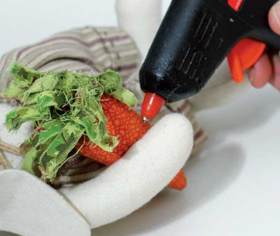 Logo após, desenhe a cenoura no tecido de algodão laranja estampado. Passe uma costura à máquina em toda a volta, deixando uma abertura na parte superior. Vire para o lado direito e encha com plumante. Corte o molde da rama da cenoura no tecido de algodão verde estampado, pesponte, picote até chegar na costura, puxe para franzir e fixe na parte de cima da cenoura. Posicione e cole a cenoura no braço do boneco. E está pronto!