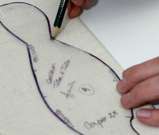 Comece desenhando a parte trás do corpo no tecido de algodão cru, em formato oval, usando o lápis. Recorte toda a borda com a tesoura, deixando uma margem de 0,5 mm. E desenhe a parte da frente do corpo no mesmo tecido e recorte da mesma forma que a parte de trás.
