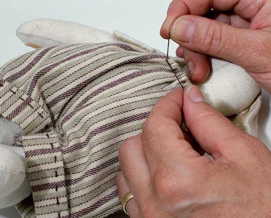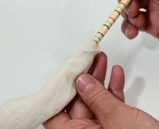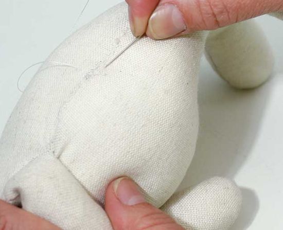 Em seguida, vire a peça para o lado direito. Encha o corpo com plumante e feche a abertura com agulha e linha nº 10 branca.