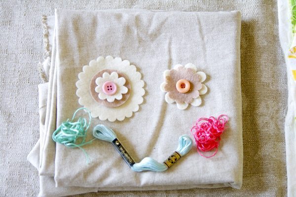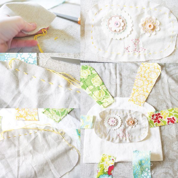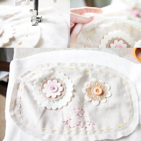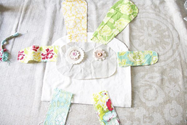 Agora, costure o botão sobre as flores de feltro em uma parte de tecido com cor contrastante com o corpo do coelho.