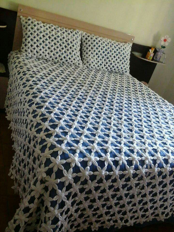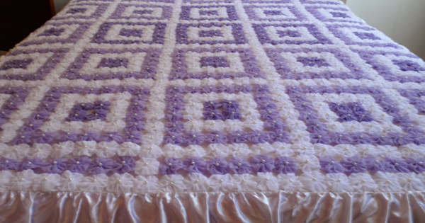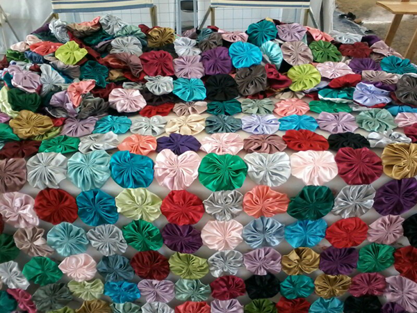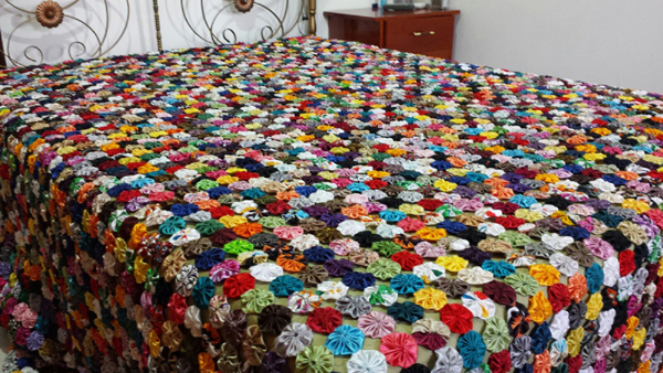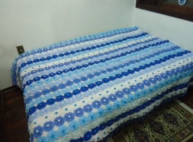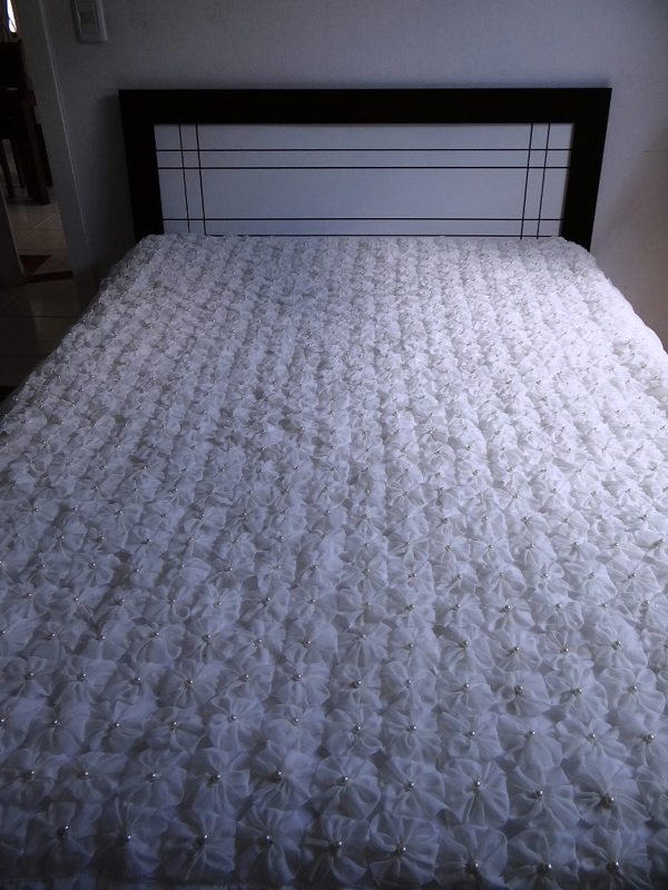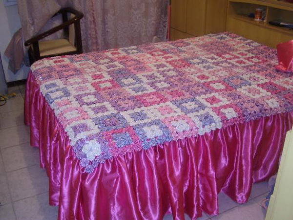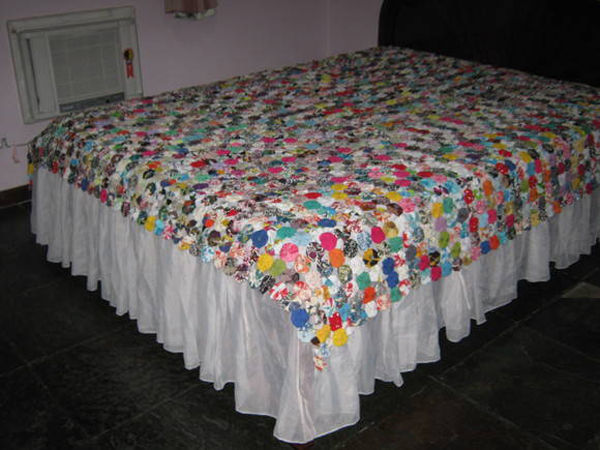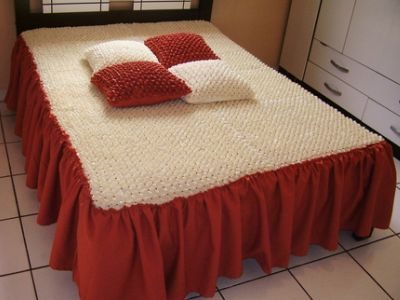 Há entre os modelos colcha de fuxico de cetim, colcha de fuxico com babado, entre muitas outras.