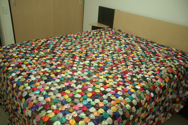 Corte círculos e faça os fuxicos, passando a agulha com linha pela borda do círculo, dobrando uma barrinha. Puxe a linha, criando o fuxico, arrume com os dedos e arremate a linha. Nesta colcha foram usados 408 fuxicos.