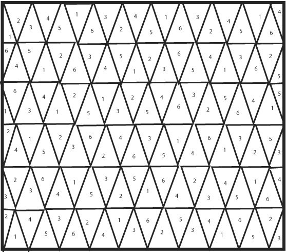 Em seguida, transfira o molde para os seus tecidos e prenda um triângulo a outro com o auxílio de alfinetes para costura. Depois, quando chegar ao tamanho desejado para a sua colcha, corte a manta acrílica com este tamanho e corte também o forro com o mesmo tamanho.
