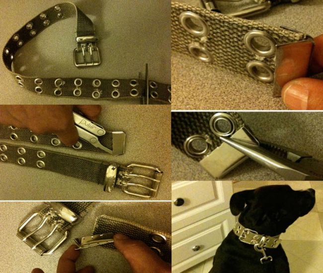 Você pode cortar um cinto e recolocar a fivela e a ponteira com o tamanho adequado para o tamanho do pescoço do seu cãozinho.