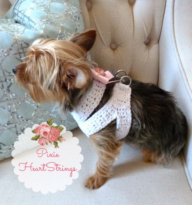 Faça um triângulo de crochê, com pontos baixos. Na ponta do triângulo faça a parte que vai no pescoço do seu pet. Para facilitar, faça esta parte aberta e fixe velcro nas pontas. Faça duas tiras de crochê em cada lateral do triângulo e feche, para poder fixar argolas.