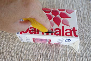 Comece riscando um quadrado na parte da frente e na parte de trás da caixa de leite. A 5 cm da parte de cima da caixa, com margens de 1 cm cada lado e a 3 cm da parte de baixo da caixa de leite.